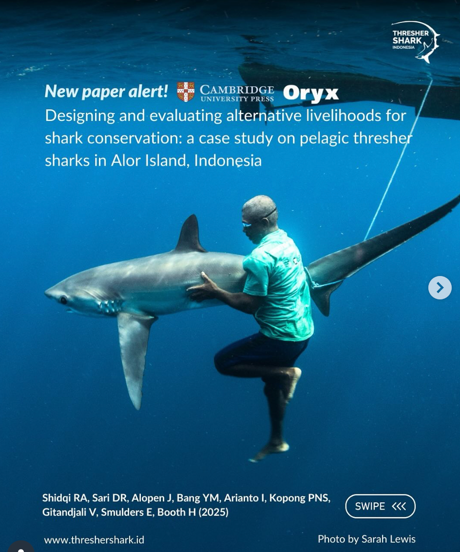 For over five years, Thresher Shark Indonesia has been working in Alor to safeguard thresher sharks while supporting local communities. Their latest research, published inOryx (Cambridge University Press) and led by Co-Founder Rafi D. Shidqi, shows that this approach works.