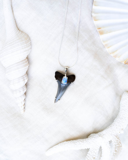 Fossilised shark tooth necklace in a claw wrap embellished with a light ocean blue Australian boulder opal on an 18" chain. 1.3" in length.