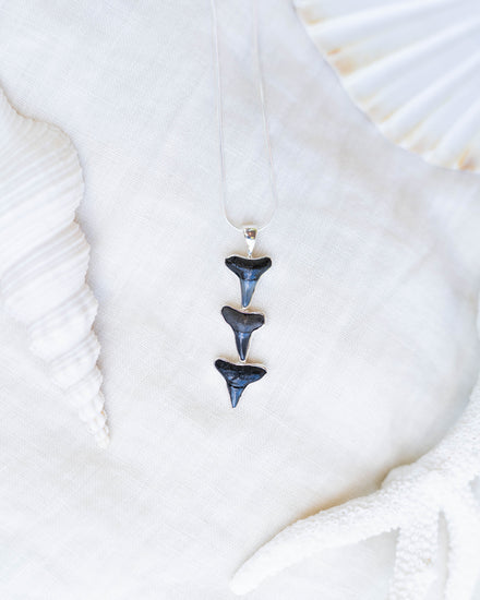 Stunning triple bezel fossilised shark tooth pendant with 18" chain. 1.5" in length.