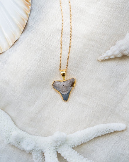 Simple and oh so elegant - Fossilised shark tooth necklace with an 18" gold plated chain. A treasure from the depths, encapsulated with the story of the sea. 0.7" in length.