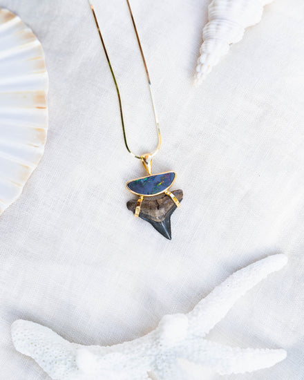 Mesmerizing Australian Boulder opal paired with a pristine fossilised shark tooth on an 18" gold plated chain. 1.2" in length.