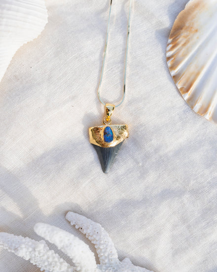 Fossilised Great White Shark tooth in a textured gold plated casing featuring a stunning Australian Opal with an 18" gold plated chain. 1.0" in length.