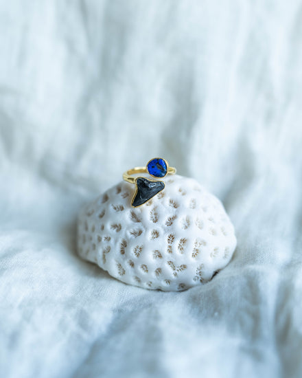 Our iconic & best selling ring design. Fossilised shark tooth in a wrap-around design featuring beautiful solid Australian boulder opal.