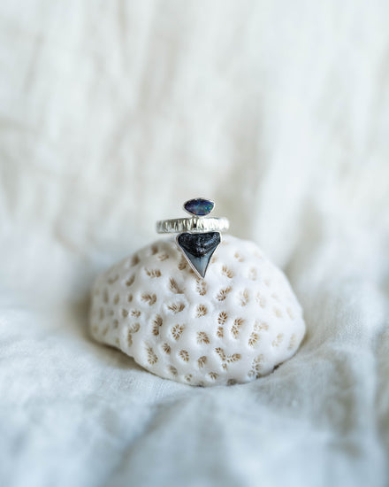 Fossilized shark tooth paired with a vibrant Australian boulder opal on a hand-hammered band. The textured band reflects sunlight like ripples across water, and the shifting hues of the opal mirror the ocean’s rolling crests.