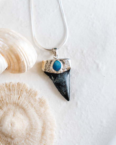 Fossilised Great White Shark tooth in a textured silver casing featuring a stunning Australian Opal with an 17" chain. 1.5" in length.