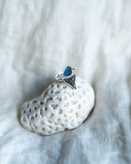 Our iconic & best selling ring design. Fossilised shark tooth in a wrap-around design featuring beautiful solid Australian boulder opal.