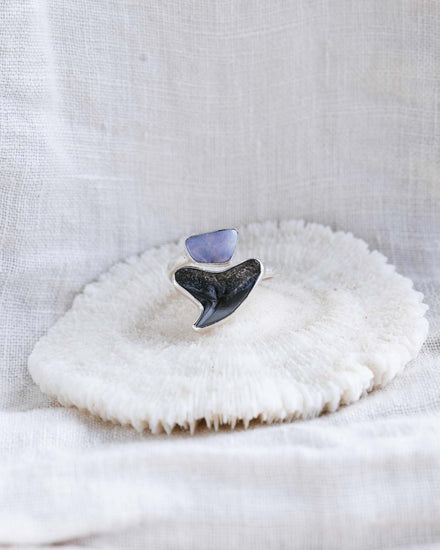 Our iconic & best selling ring design. Fossilised shark tooth in a wrap-around design featuring beautiful solid Australian boulder opal.